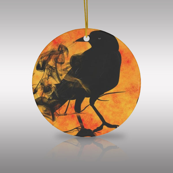 Our Halloween Raven Bird Ornament is uniquely designed by talented artists and designers to bring you an original ornament to be treasured for years to come! This spooky design features the silhouette of a raven with an orange background on a single-sided ceramic disc. Glossy on front and back, it comes with a gold loop for easy hanging.
