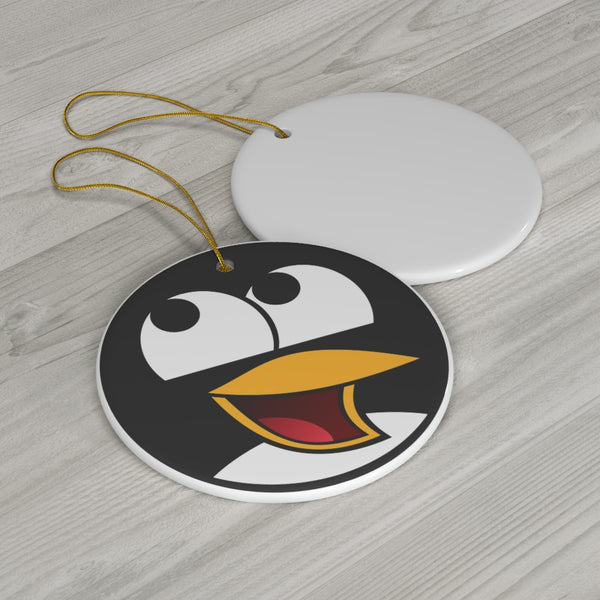 Our Happy Penguin Ornament is uniquely designed by talented artists and designers to bring you an original ornament to be treasured for years to come! This adorable design features a happy penguin in a cartoon style on a single-sided ceramic disc. Glossy on front and back, it comes with a gold loop for easy hanging.
