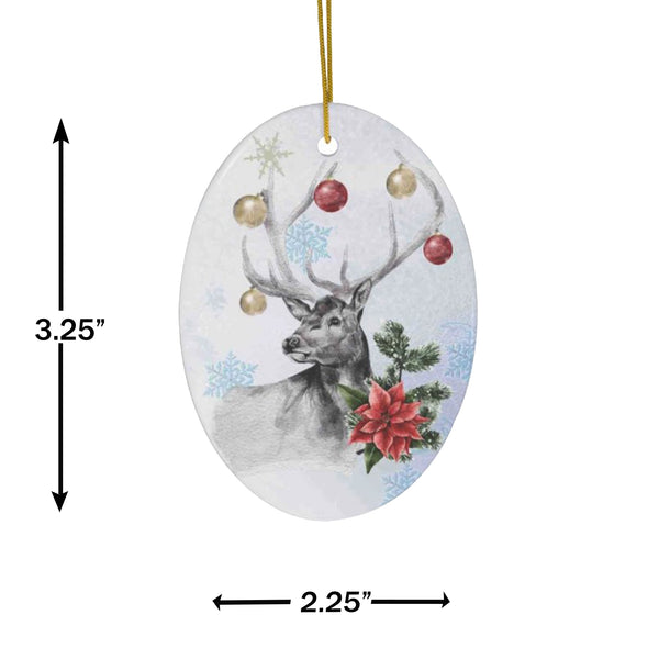 Our Ornamental Christmas Deer Ceramic Ornament by Nature's Glow is uniquely designed to bring you an original ornament to be treasured for years to come! This beautiful piece highlights a woodland deer with poinsettia and Christmas balls on its antlers on a white background, single-sided ceramic disc. Glossy on front and back, it comes with a gold loop for easy hanging.