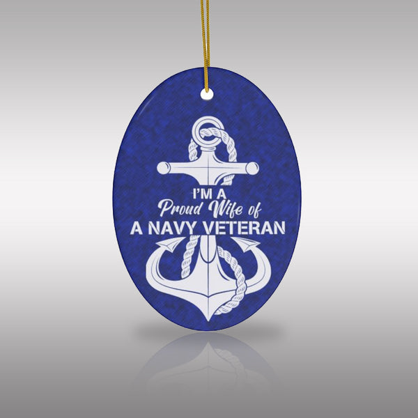 Our Patriotic Proud Wife of US Navy Reserve Ornament by Nature's Glow is uniquely designed by talented artists and designers to bring you an original ornament to be treasured for years to come! This piece features the phrase "I'm a proud wife of a Navy veteran" printed in white with a white anchor against a navy blue background. Glossy on front and back, it comes with a gold loop for easy hanging.