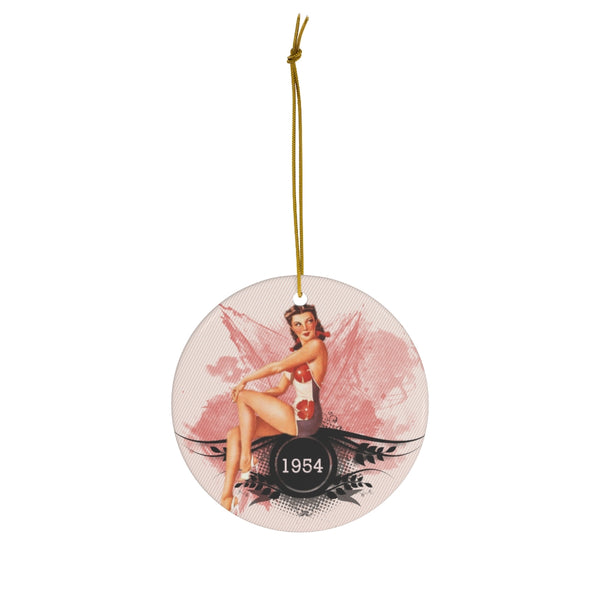 Our Vintage Pin Up Model Ornament is uniquely designed by talented artists and designers to bring you an original ornament to be treasured for years to come! This nostalgic piece showcases a retro 1954 woman dressed in a red hibiscus swim suit highlighted by a pink and beige background on a single-sided ceramic disc. Glossy on front and back, it comes with a gold loop for easy hanging.
